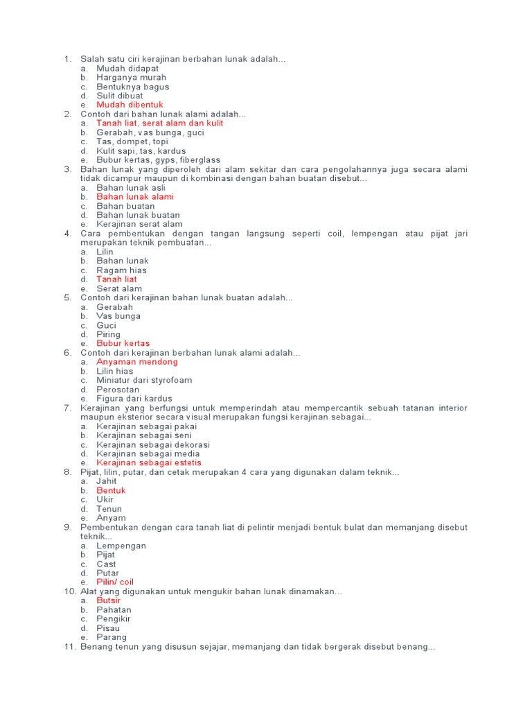 Contoh dari Bahan lunak alami adalah, Contoh dari kerajinan Bahan lunak buatan adalah, Syarat dari kerajinan berbahan lunak yang mampu memberikan kenyamanan konsumen adalah, Contoh dari kerajinan berbahan lunak alami adalah, Bahan lunak dibedakan menjadi dua berdasarkan sumbernya yaitu, Teknik pembuatan produk dari bahan lunak, kecuali, Alat yang digunakan untuk mengukir Bahan lunak dinamakan, Aneka produk kerajinan dari bahan lunak yaitu, kecuali, Bahan untuk karya kerajinan yang diolah menjadi lunak merupakan pengertian dari, Sumber daya produksi kerajinan berbahan lunak, kecuali, Contoh bahan yang bersifat lunak alami adalah, Guci merupakan contoh produk kerajinan Bahan lunak,